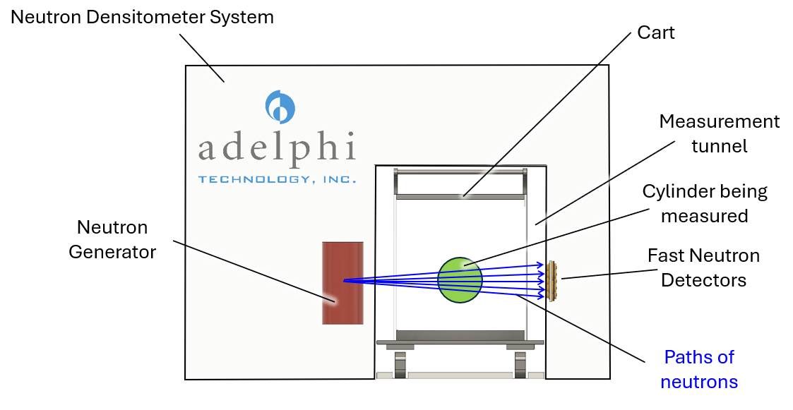 The Images show the system, and simulated neutron distribition. The "football" sized objects shown in the picture were not real objects, they were imaginary volumes that we used to determine the radiation dose that would be received at various positions from the open neutron densitometer's measurement 'tunnel'.